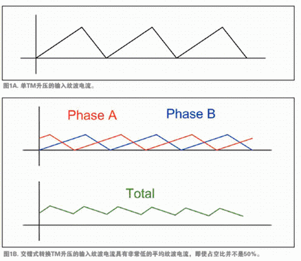 為了生產(chǎn)的更薄、高效而廉價的電源,近來開發(fā)了UCC28060,在單一設(shè)備中采用兩個交錯式轉(zhuǎn)換通道TM PFC的集成電路。UCC28060充分發(fā)揮了TM的全部優(yōu)勢,并利用交錯式轉(zhuǎn)換的優(yōu)勢來彌補TM的缺點。例如,如圖1A與1B所示,交錯式轉(zhuǎn)換降低了輸入紋波電流,所以可以使用小得多的EMI濾波器。交錯式轉(zhuǎn)換還降低了輸出波紋,可使用較小的輸出電容,并能延長電容壽命。交錯式轉(zhuǎn)換還可將一個大電感分成兩個較小的電感,提高了功率級別并實現(xiàn)了超薄的封裝。