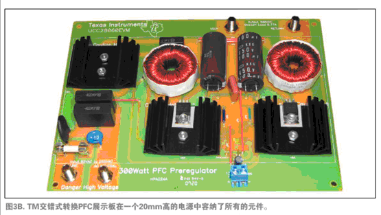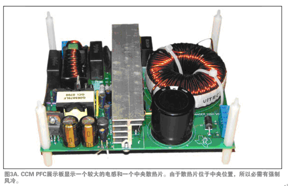 圖3A與3B顯示了兩個原型電源。圖3A是一個有正向轉(zhuǎn)換器進行輸出穩(wěn)壓的單相CCM PFC及一個EMI濾波器。在此電源中,電感、大型濾波電容及散熱片體積均較大,位于中央位置,使電源體積略為龐大。圖3B是一個兩相交錯式轉(zhuǎn)換TM PFC。交錯式轉(zhuǎn)換電源非常薄,因為電感體積縮小了,輸出濾波器電容尺寸及布局均為散熱而考慮。如果布局采用同樣的規(guī)則,交錯式轉(zhuǎn)換TM PFC也可以縮小體積。