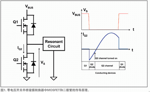 圖1所示為零電壓開(kāi)關(guān)半橋諧振轉(zhuǎn)換器中MOSFET和體二極管的傳導(dǎo)原理。在這種轉(zhuǎn)換器中,電流波形滯后于電壓。假設(shè)Q1開(kāi)通,Q2關(guān)斷。Q1傳導(dǎo)諧振電流。在一定時(shí)間之后,由控制環(huán)路決定,Q1關(guān)斷。這時(shí),諧振電流流經(jīng)Q2的體二極管。在負(fù)電流期間的某一時(shí)刻,Q2導(dǎo)通,減小傳導(dǎo)損耗。當(dāng)其上電壓為體二極管的正向電壓時(shí)(遠(yuǎn)小于總線電壓),Q2導(dǎo)通。這就是有效的零電壓開(kāi)關(guān)。Q2中的諧振電流反向。在一定時(shí)間之后,同樣由控制環(huán)路決定,Q2關(guān)斷。當(dāng)大電流流過(guò),且Q2的電壓擺幅接近總線電壓時(shí),這種關(guān)斷順序并非低損耗。