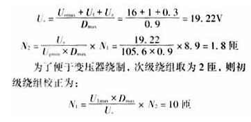計(jì)算原副邊繞組匝數(shù):按輸入電壓最低及輸出滿載的情況(此時(shí)占空比最大)來計(jì)算原副邊繞組匝數(shù),已知Umin=176V經(jīng)整流濾波后直流輸入電壓Udmin=1.2×176=211.2V。