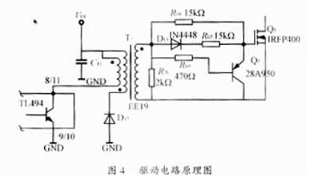 驅(qū)動(dòng)電路如圖4所示。TL494輸出50kHz的脈沖信號,通過高頻脈沖變壓器耦合去驅(qū)動(dòng)功率MOS管。次級脈沖電壓為正時(shí),MOS管導(dǎo)通,在此期間Q7截止,由其構(gòu)成的泄放電路不工作。當(dāng)次級脈沖電壓為零時(shí),則Q7導(dǎo)通,快速泄放MOS管柵級電荷,加速M(fèi)OS管截止。R70是用于抑制驅(qū)動(dòng)脈沖的尖峰,R68、D15、R67可以加速驅(qū)動(dòng)并防止驅(qū)動(dòng)脈沖產(chǎn)生振蕩。D17和與它相連的脈沖變壓器繞組共同構(gòu)成去磁電路。