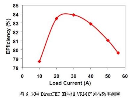 圖6給出了當(dāng)環(huán)境溫度為35℃、空氣流量為400LFM時(shí)在風(fēng)洞中測(cè)得的兩相VRM板的效率曲線(xiàn)圖。由圖可見(jiàn),VRM在負(fù)載電流高達(dá)25A/相位的情況下獲得了80%以上的效率。