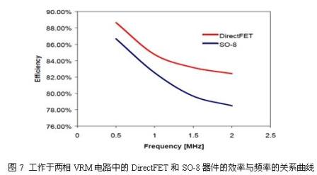 圖7示出了工作于兩相VRM電路中的DirectFET和SO-8器件的效率與頻率的關(guān)系曲線(xiàn)。兩者的效率測(cè)量都是在20A/相位的負(fù)載電流條件下進(jìn)行。在整個(gè)頻譜范圍內(nèi),采用DirectFET的VRM電路表現(xiàn)出高于采用SO-8的VRM電路的效率水平。兩種電路的效率差異還會(huì)隨著頻率的升高而增大。該結(jié)果反映出DirectFET器件的封裝寄生損耗較SO-8器件低。DirectFET封裝器件還能夠在更高的負(fù)載電流條件下工作。例如,在1MHz條件下,DirectFET VRM電路能夠?qū)Ω哌_(dá)30A/相位的負(fù)載電流進(jìn)行開(kāi)關(guān)操作,并同時(shí)將電路板的溫度維持在100℃以下。而在相同的工作條件下,SO-8器件則只能對(duì)20A/相位左右的負(fù)載電流進(jìn)行開(kāi)關(guān)操作。DirectFET VRM電路較高的電流處理能力可歸功于結(jié)合了更低的封裝寄生效應(yīng)以及更高的熱