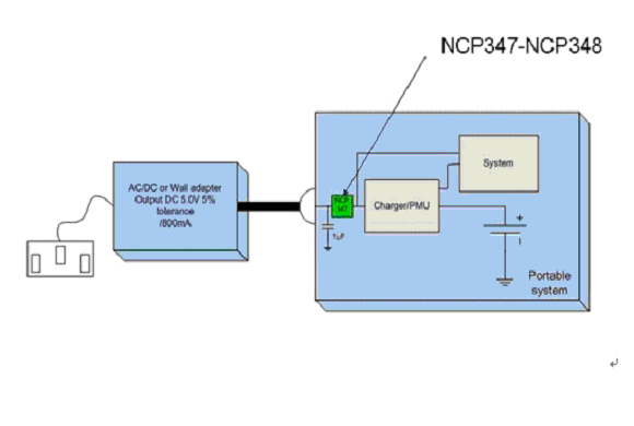 OVLO所定的電平必須高于AC-DC的最大輸出工作電壓并低于系統(tǒng)首個(gè)元件的最大額定電壓。圖1所示為一個(gè)基于全集成OVP器件的典型便攜式設(shè)備的結(jié)構(gòu)(此處的OVP采用的是NCP347MTAE)。