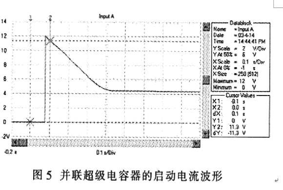 超級(jí)電容器">電容器與蓄電池并聯(lián)時(shí),汽車啟動(dòng)過程的電壓波形如圖4所示,電流波形如圖5所示。與圖1和圖2相比,啟動(dòng)瞬間電壓跌落由只采用蓄電池時(shí)的3.2V提升到7.2V;啟動(dòng)電流從560 A提高到l200 A;啟動(dòng)瞬時(shí)的電源輸出功率從2 kW上升到8.7kW;啟動(dòng)過程的平穩(wěn)電壓由7 V提高到9 .4 V;啟動(dòng)過程的平穩(wěn)電流由280 A提高到440 A;啟動(dòng)過程的電源平穩(wěn)輸出功率從2.44 kW提高到4.12 kW。