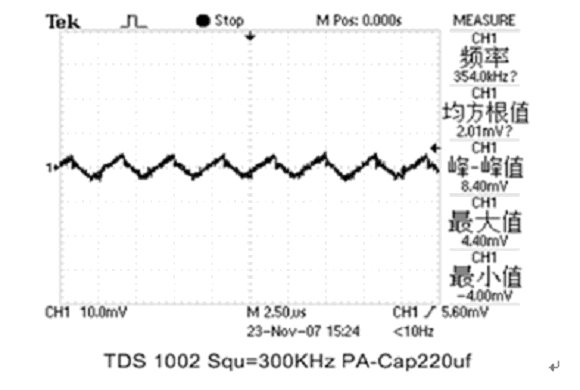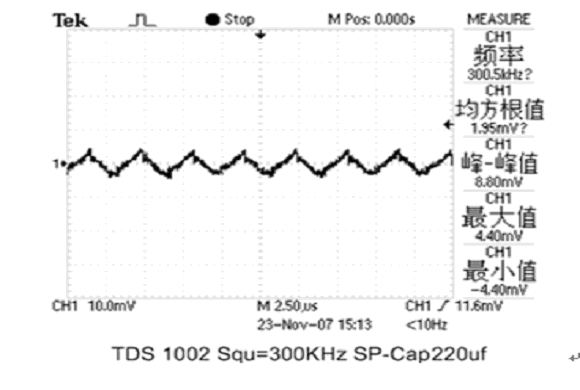 現(xiàn)分別用1只2V/220μF PA-Cap或2V/220μF松下公司聚合物固體疊層鋁電解電容器(SP-Cap)接在輸出電容Cout位置,測(cè)試其濾波效果。輸出波形如圖4和圖5所示:
