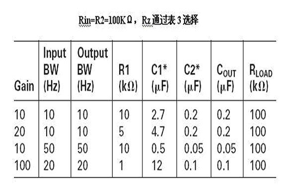 設(shè)計單電源運(yùn)算放大器電路,需要考慮輸入偏置電流誤差、電源抑制、增益、以及輸入與輸出線路帶寬等等。然而普通的應(yīng)用設(shè)計是可以通過查表來獲得,見表1。在單電源電壓為15V或12V時偏置分壓的兩個電阻通常選用100kΩ,這樣可以在電源消耗與輸入偏置電流誤差之間合理的折中。5V單電源偏置分壓電阻減小到一個比較低的值,例如42kΩ。還有些在3.3V應(yīng)用中偏置分壓電阻選在27kΩ左右。