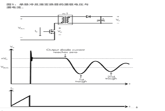 圖1說(shuō)明了在非連續(xù)導(dǎo)通模式下工作的電流模式反激變換器的漏極波形,這里只施加了一個(gè)門(mén)脈沖。在第一個(gè)時(shí)間間隔,漏電流上升,直到達(dá)到所需的電流強(qiáng)度,此時(shí)電源開(kāi)關(guān)關(guān)閉,回轉(zhuǎn)變壓器中的漏電感與節(jié)點(diǎn)電容形成諧振。這會(huì)導(dǎo)致漏電感浪涌,該浪涌受箝位電路限制,在電感浪涌消失后,漏極電壓返回到等于輸入電壓加上初級(jí)線圈感應(yīng)電壓的水平。如果忽略初級(jí)線圈電感和節(jié)點(diǎn)電容的影響,當(dāng)輸出二極管中的電流降到零時(shí),漏極電壓立即降到總線電壓,但漏極電壓衰減到如圖1所示的水平。