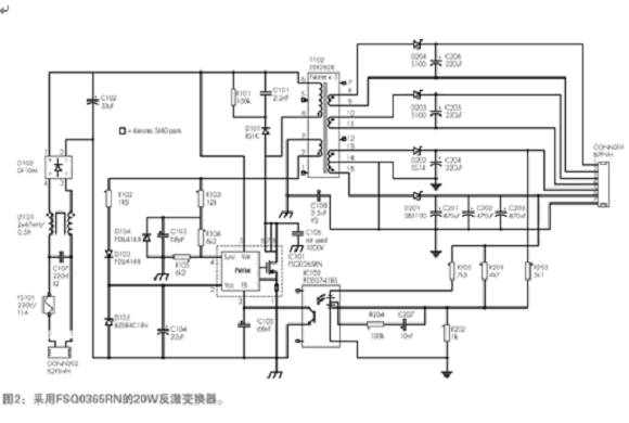 圖2說(shuō)明了Fairchild全球電源資源中心德國(guó)的設(shè)計(jì)的示例應(yīng)用,R103-5、D104和C103為檢測(cè)最小漏極電壓所需的額外元件,F(xiàn)OD2741為誤差放大器,它在同一封裝中結(jié)合了標(biāo)準(zhǔn)光耦合器和工業(yè)標(biāo)準(zhǔn)的431參考,其它元件為反激變換器的標(biāo)準(zhǔn)部分。