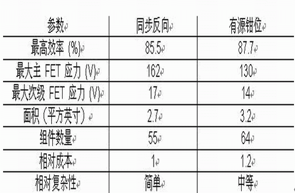 表 2 列出了對兩種同步反向電源主要部分進行比較的總結(jié)。該表說明了有源鉗位反向電源相對于變壓器驅(qū)動同步反向電源在性能上的優(yōu)勢。尤其是在輕負載情況下,有源鉗位反向電源具有更低的 FET 電壓應(yīng)力及更高的效率。有源鉗位控制器 (UCC2897) 的可編程停滯時間特性(該特性可防止主、次級 FET 的疊加傳導 (overlapping conduction))有助于最小化 Q1 二次側(cè)直通損耗。這些損耗一般表現(xiàn)為可在主電流感應(yīng)電阻器上觀測到的一個大電流峰值,且經(jīng)常會導致輕負載抖動的問題。有源鉗位反向電源較低的高頻振鈴會產(chǎn)生更少的 EMI 及一個全局范圍內(nèi)更低噪聲的電源。由于漏極電感對有源鉗位電路性能的影響較小,因此,盡管同步反向電源并不是一無是處,但比起帶有同步反向的情況,高頻操作更有可能實現(xiàn)。在這兩個示例電路中,與有源鉗位反向電源相比,傳統(tǒng)的同步反向電源可將 PWB 面積、組件數(shù)量和成本上降低大約 15%~20%。這是一款容易設(shè)計和(可論證性地)理解的更簡單的電路,雖然如此,但還是要考慮到其在性能上的一些不足。那么,您應(yīng)該在什么時候選擇一個有源鉗位反向電源呢?如果輸出功率較低,同時設(shè)計要求一直進行連續(xù)模式運行,那么有源鉗位反向電源可以實現(xiàn)高效率、低 EMI 運行。在輕負載效率較為關(guān)鍵的應(yīng)用中,它具有一個更為明顯的優(yōu)勢。