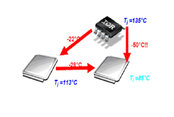 以一個每相30A的多相變換器為例,要滿足這個電流,用最好的單面散熱的SO8封裝MOSFET,比如標準的SO-8,無底的SO-8和無鉛的SO-8,每相要用五只,而雙面散熱的DirectFET 只需兩只。比較結果元件數(shù)減少了60%。