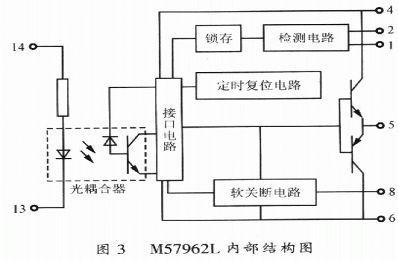 M57962AL是一種14腳單列直捕式結(jié)構(gòu)的厚膜驅(qū)動(dòng)模塊,其內(nèi)部結(jié)構(gòu)圖如圖3所示。它由光耦合器、接口電路、檢測(cè)電路、定時(shí)復(fù)位電路以及門關(guān)斷電路組成,驅(qū)動(dòng)功率大,町以驅(qū)動(dòng)600A/600V及400A/l200V等系列IGBT模塊。
