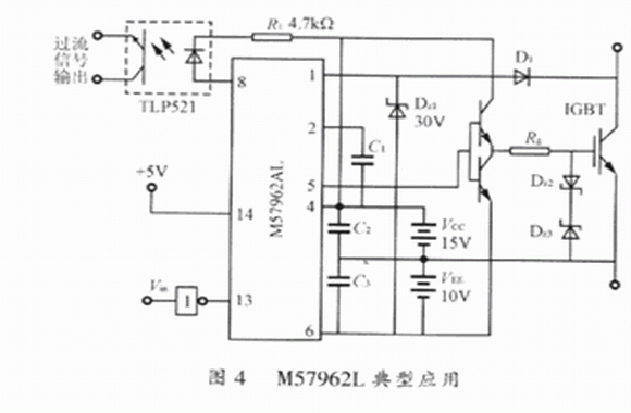 M5796AL具有高速的輸入輸出隔離,絕緣電壓也可達(dá)到AC 2500V/min;輸入電平與TTL電平兼容,適于單片機(jī)控制;內(nèi)部有定時(shí)邏輯短路保護(hù)電路,同時(shí)具有延時(shí)保護(hù)特性;采用雙電源供電方式,相對(duì)于EXB84l來(lái)說(shuō),雖然多使用一個(gè)電源.但I(xiàn)GBT可以更可靠地通斷。