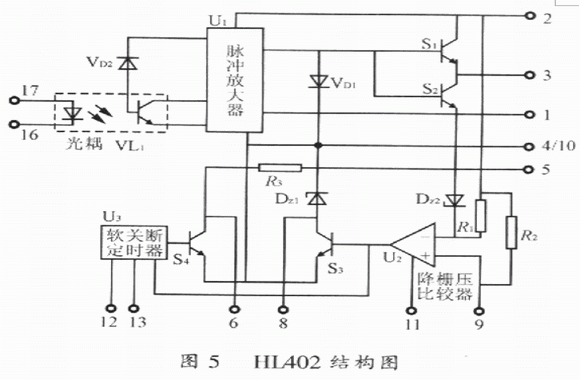 HL402結(jié)構(gòu)圖如圖5所示。圖5中,VL1為帶靜電屏蔽的光耦合器,它用來(lái)實(shí)現(xiàn)與輸入信號(hào)的隔離。由于它具有靜電屏蔽,因而顯著提高了HL402抗共模干擾的能力。圖5中U1為脈沖放大器,S1、S2實(shí)現(xiàn)驅(qū)動(dòng)脈沖功率放大,U2為降柵壓比較器,正常情況下由于腳9輸入的IGBT集電極電壓VCE不高于U2的基準(zhǔn)電壓VREF,U2不翻轉(zhuǎn),S3不導(dǎo)通,故從腳17和腳16輸入的驅(qū)動(dòng)脈沖信號(hào)經(jīng)S2整形后不被封鎖。該驅(qū)動(dòng)脈沖經(jīng)S2、S2放大后提供給IGBT使其導(dǎo)通或關(guān)斷,一旦IGBT退飽和,則腳9輸入集電極電壓給IGBT使其導(dǎo)通或關(guān)斷,并且腳9輸入的集電極電壓采樣信號(hào)VCE高于U2的基準(zhǔn)電壓VREF,比較器U2翻轉(zhuǎn)輸出高電平,使S3導(dǎo)通,由穩(wěn)壓管DZ2將驅(qū)動(dòng)器輸出的柵極電壓VGE降低到10V。此時(shí),軟關(guān)斷定時(shí)器U3在降柵壓比較器U2翻轉(zhuǎn)達(dá)到設(shè)定的時(shí)間后,輸出正電壓使S4導(dǎo)通,將柵極電壓軟關(guān)斷降到IGBT的柵射極門限電壓,給IGBT提供一個(gè)負(fù)的驅(qū)動(dòng)電壓,保證IGBT可靠關(guān)斷。