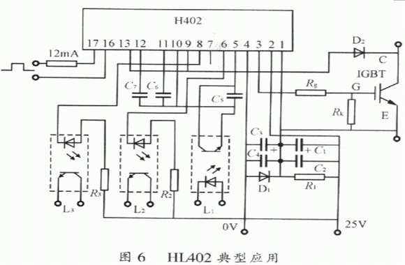 HL402是17腳單列直插式結(jié)構(gòu),內(nèi)置有靜電屏蔽層的高速光耦合器實(shí)現(xiàn)信號(hào)隔離,抗干擾能力強(qiáng),響應(yīng)速度快,隔離電壓高。它具有對(duì)IGBT進(jìn)行降柵壓、軟關(guān)斷雙重保護(hù)功能,在軟關(guān)斷及降柵壓的同時(shí)能輸出報(bào)警信號(hào),實(shí)現(xiàn)封鎖脈沖或分?jǐn)嘀骰芈返谋Wo(hù)。它輸出驅(qū)動(dòng)電壓幅值高,正向驅(qū)動(dòng)電壓可達(dá)15~17V,負(fù)向偏置電壓可達(dá)10~12V,因而可用來(lái)直接驅(qū)動(dòng)容量為400A/600V及300A/1200V以下的IGBT。