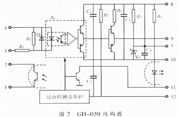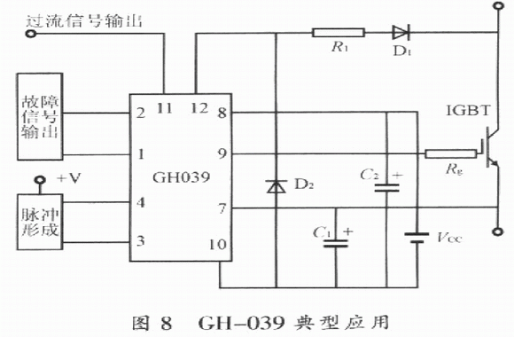 其內(nèi)部結(jié)構(gòu)圖如圖7所示,工作原理與EXB和M57系列模塊相類似,這里不再贅述。而與EXB系列和M57系列的模塊不同的是該模塊已含有保護(hù)后發(fā)送報(bào)警或動(dòng)作信號(hào)的光耦合器,所以使用中不需要像EXB和M57系列的模塊外接光耦合器,因而更加方便,其性能比EXB和M57系列的模塊在保護(hù)性能上更加優(yōu)越;在可靠性方面,由于GH-039是單電源供電,不能提供負(fù)偏壓,從而導(dǎo)致ICBT不能可靠地關(guān)斷。與HL402相比,CH-039保護(hù)功能還不完善,它也同EXB841和M57962AL一樣無(wú)降柵壓保護(hù)。因此,GH-039驅(qū)動(dòng)模塊也是有缺陷的。