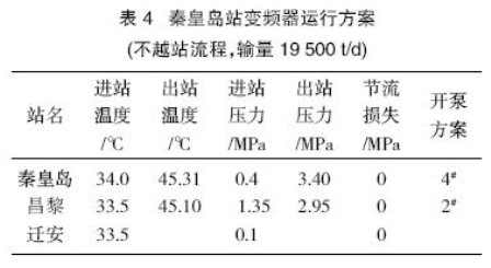 秦皇島站運行4#輸油泵節(jié)流損失0.80 MPa,運行2#輸油泵節(jié)流損失1.2 MPa,浪費很多電能,并且運行中這兩臺泵的震動很大。綜合考慮(冀東油田來油量逐年遞增,秦皇島外輸量逐年遞減,輸量不穩(wěn)定)通過采用更換或切削泵葉輪的方案解決該站節(jié)流損失的方案不可取,應考慮在秦皇島站增加調速裝置,調節(jié)揚程及輸量。故采用了表4所列的變頻器運行方案。