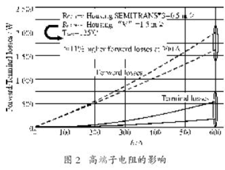 模塊的端子電阻對(duì)電路的工作效率的影響如圖2所示。在圖2所示的例子中,舉例的開(kāi)關(guān)導(dǎo)通損耗比SEMITRANS高11%。這相當(dāng)于一個(gè)每相絕對(duì)值約90 W,三相共270 W的功率變頻器。