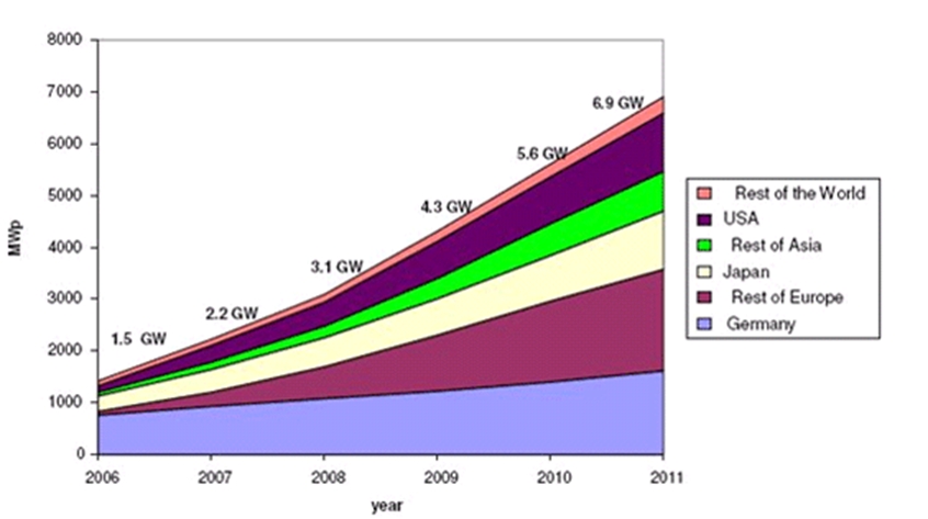 中國(guó)政府在《可再生能源長(zhǎng)期規(guī)劃》提出,太陽能光伏發(fā)電裝機(jī)容量到2010年將發(fā)展到450MWp,而2005年全國(guó)太陽能發(fā)電裝機(jī)容量?jī)H為6.5MWp,這就意味著中國(guó)太陽能裝機(jī)容量的復(fù)合增長(zhǎng)率將會(huì)高達(dá)38%以上。了解目前太陽能光伏市場(chǎng)發(fā)展動(dòng)態(tài),把握太陽能光伏行業(yè)發(fā)展趨勢(shì),對(duì)于半導(dǎo)體行業(yè)的發(fā)展是至關(guān)重要的。