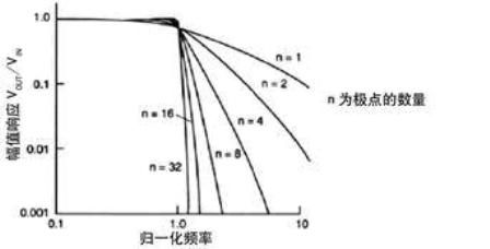 圖1 幾個低通濾波器的幅值響應與歸一化頻率的關系曲線。如果濾波器傳遞函數(shù)有多個極點(或階數(shù)),則頻率越高,衰減越快。