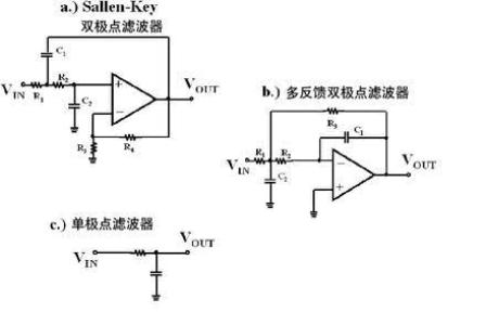 圖4 Sallen-Key (a)和多反饋 (b)濾波器都是2階,都有2個極點。單極點濾波器(c)是1階濾波器。這些模塊可以級聯(lián),以生成高階濾波器。