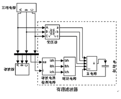 該有源濾波器主要由諧波電流檢測(cè)電路、驅(qū)動(dòng)電路、主電路、電容器和變壓器5大部分組成。變壓器的設(shè)置主要是為調(diào)節(jié)有源電力濾波器交流側(cè)電壓之用。其原理如圖1所示。其中的諧波源模塊是根據(jù)主提升機(jī)房實(shí)際諧波測(cè)試數(shù)據(jù)建成的。