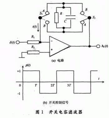開關(guān)電容有源濾波器電路如圖1(a),其中S1和S2是由周期為2T的方波信號控制的理想電子開關(guān),方波控制信號p(t)波形如圖1(b),其占空系數(shù)為0.5。即在2kT<t<(2K+1)T期間兩開關(guān)接通A點,在(2K+1)T<t<(2K+2)T期間兩開關(guān)接通B點,其中K=0,1,2,…,是時段編號。