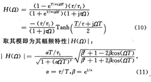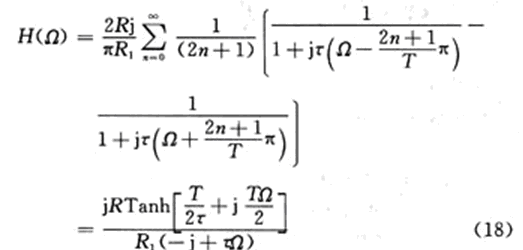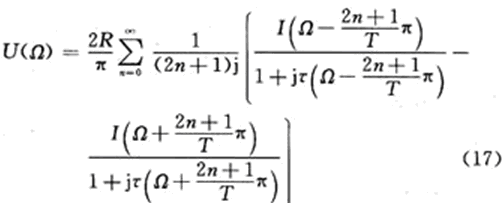 上式說明,Ie(Ω)是輸入電流頻譜I(Ω)周期延拓的組合,周期為Ω0=2π/T。各電流分量流過RC并聯(lián)支路時的電壓為相應(yīng)電流分量與RC支路阻抗(R/(1+jωτ),ω=Ω±(2n+1)π/T)的乘積,于是輸出電壓頻譜U(Ω)為: