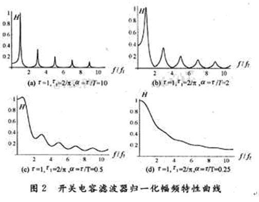 (4)隨著電子開關(guān)切換周期2T增大(α減小),梳齒間谷底最小值逐漸增大。電路逐漸過渡為幅頻特性曲線輕微起伏的低通濾波器,如圖2(d)所示。低通濾波器傳輸函數(shù)極大值為: