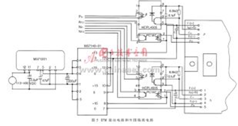 筆者在DSP控制開關(guān)磁阻電機(jī)的項目中,選用IPM作為功率變換器的主開關(guān)器件,控制器采用了德州公司的TMS320F240 數(shù)字信號處理器,功率驅(qū)動電路的輸入(即IPM的控制信號)由TMS320F240內(nèi)含的全比較單元相對應(yīng)的PWM1~PWM4產(chǎn)生。