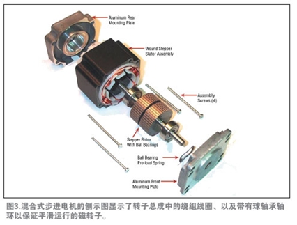 混合式步進(jìn)電機(jī)結(jié)合了永磁和開關(guān)磁阻電機(jī)的工作原理,在轉(zhuǎn)子軸上裝有一對(duì)或多對(duì)外圓周有很多齒的定子疊片,在每對(duì)定子疊片間有一個(gè)永磁體,會(huì)在軸向上生成北極和南極。齒的數(shù)量、電機(jī)結(jié)構(gòu)與驅(qū)動(dòng)方案等幾項(xiàng)因素確定了電機(jī)的步進(jìn)角度,多數(shù)應(yīng)用指定了混合式步進(jìn)電機(jī)1.8°的步長(每轉(zhuǎn)200步長)(見參考資料)。
