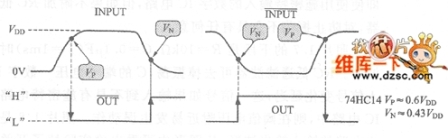 通常CMOS數(shù)字IC的閾值電壓(區(qū)別L和H的電壓電平)VT,只是一點(diǎn),圖1表示具有施密特觸發(fā)電路的反相電路、74HC14的閾值電壓。施密特觸發(fā)電路具有高電平閾值Vp和低電平閾值Vn,閾值間具有磁滯電壓VH,VH為Vp-VN。即VP以下的輸人電平可被確定邏輯輸出;磁滯電壓VH,以下時(shí),即使有噪聲,輸出電平也不變化。因此,具有施密特輸人的數(shù)字IC電路,即使加上變化緩慢的信號(hào),因噪聲等引起輸出電平翻轉(zhuǎn)的危險(xiǎn)也會(huì)變少。在數(shù)字電路的輸人電路中插入RC低通濾波器,可去掉輸人信號(hào)中含有的噪聲,整形輸出波形。