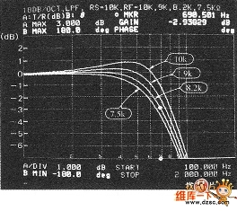 而現(xiàn)在還不清楚在電路中用于最平坦特性的正反饋量的計算步驟,所以可用實驗來求得。圖3是C=0.01μF、RF=16kΩ(通常fc=1kHz),反饋電阻RF在7.5k~10kΩ變化時的頻率特性。標(biāo)識點為8.2kΩ的曲線被認(rèn)為是最平坦的反饋電阻值。