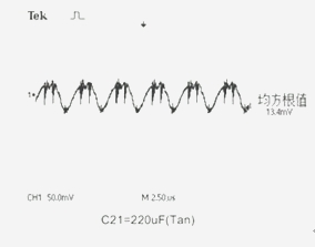 電路中電壓輸入端C6.7.8接入PA-Cap 6.3V/22μF。在輸出端C20.21位置分別接上鉭電解電容器:10V/470μF、16V/220μF和PA-Cap聚合物電容器:10V/22μF、4V/82μF作為濾波電容器,用示波器測量電路的輸出紋波電壓Vr。