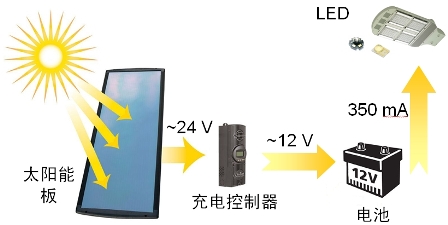 圖1:典型的太陽(yáng)能供電街道照明系統(tǒng)示意圖。
