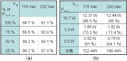 表2:NCP1380谷底開關(guān)控制器的工作能效及待機(jī)能耗(a、工作能效;b、輕載及空載能耗)