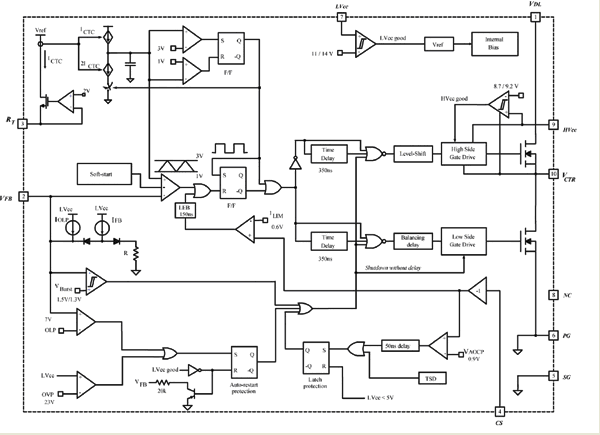 飛兆半導(dǎo)體的集成式“Green FPS”功率開(kāi)關(guān)FSFA2100系列是專門針對(duì)不對(duì)稱半橋轉(zhuǎn)換器設(shè)計(jì)而開(kāi)發(fā)的一種技術(shù)。這種技術(shù)在單個(gè)器件中整合了PWM控制器、高端驅(qū)動(dòng)和SuperFET,只需要極少數(shù)量的外部元件。圖3所示為其內(nèi)部模塊示意圖。在大功率轉(zhuǎn)換器應(yīng)用中,PCB版圖設(shè)計(jì)一向是棘手部分,因?yàn)樵诓季謺r(shí),為了把噪聲干擾降至最低,必需讓柵極驅(qū)動(dòng)器和控制電路盡可能地靠近MOSFET。FSFA2100把柵極驅(qū)動(dòng)器及控制電路與MOSFET集成在一起,使這些器件之間的距離最小化,從而大幅減小了終端應(yīng)用的噪聲干擾。此外,這樣做也減少了寶貴的設(shè)計(jì)時(shí)間,使生產(chǎn)力得以提高。