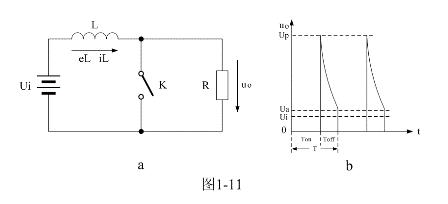 圖1-11-a是并聯(lián)式開(kāi)關(guān)電源的最簡(jiǎn)單工作原理圖,圖1-11-b是并聯(lián)式開(kāi)關(guān)電源輸出電壓的波形。圖1-11-a中Ui是開(kāi)關(guān)電源的工作電壓,L是儲(chǔ)能電感,K是控制開(kāi)關(guān),R是負(fù)載。圖1-11-b中Ui是開(kāi)關(guān)電源的輸入電壓,Uo是開(kāi)關(guān)電源輸出的電壓,Up是開(kāi)關(guān)電源輸出的峰值電壓,Ua是開(kāi)關(guān)電源輸出的平均電壓。