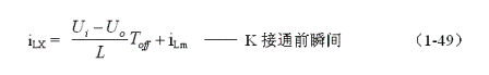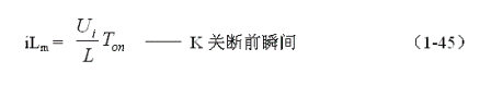 式中i(Ton+)為控制開(kāi)關(guān)K從Ton轉(zhuǎn)換到Toff的瞬間之前流過(guò)電感的電流,i(Ton+)也可以寫(xiě)為i(Toff-),即:控制開(kāi)關(guān)K關(guān)斷或接通瞬間,之前和之后流過(guò)電感L的電流相等。實(shí)際上(1-47)式中的i(Ton+)就是(1-45)式中的iLm,因此,(1-9)式可以改寫(xiě)為: