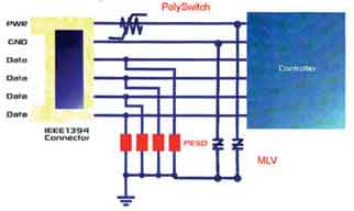 圖12及圖13分別是USB2.0接口電路的保護電路設(shè)計及IEEE1394接口電路的保護電路設(shè)計。