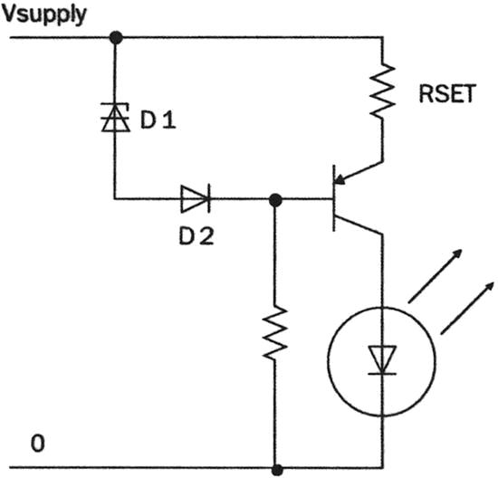 相對簡單的方案是使用線性降壓穩(wěn)壓器(圖1),D1是一個穩(wěn)壓二極管,通過LED的電流設(shè)定為VD1/RSET。D2對基極二極管進(jìn)行濕度補(bǔ)償。這個電路仍然存在能量損失問題和電阻散熱問題。對于低電流LED,尤其是串聯(lián)后的LED正向壓降和稍低于電源電壓的場合,這個電路不失為經(jīng)濟(jì)有效的方案。