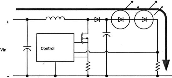 如果電源電壓低于所有LED串聯(lián)電壓和,就要選用升壓穩(wěn)壓器。升壓穩(wěn)壓器(圖3)既要控制電流,又要控制電壓,電路相對復(fù)雜些。升壓穩(wěn)壓器在大電流情況下同樣存在嚴(yán)重的干擾問題。因而最穩(wěn)定又最安全的LED驅(qū)動器可采用升壓與降壓相結(jié)合的形式。一個升壓穩(wěn)壓器可驅(qū)動幾個并聯(lián)的降壓穩(wěn)壓器。這樣,面對電源的是性能良好的升壓穩(wěn)壓器,而在負(fù)載端則是高電流輸出的降壓穩(wěn)壓器。