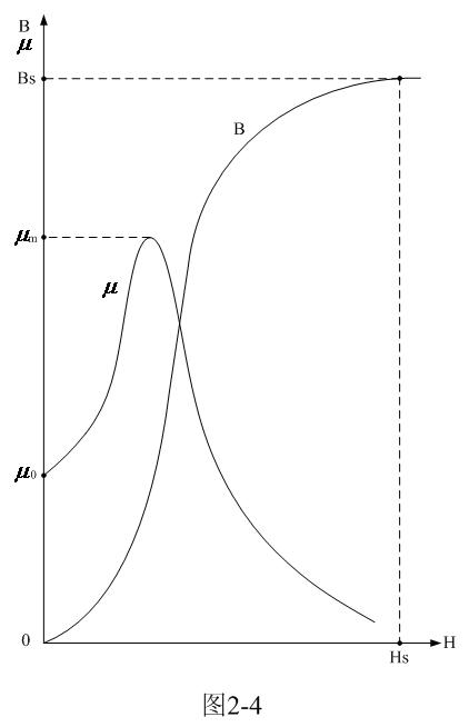 在圖2-4中,曲線B為磁通密度對(duì)應(yīng)磁場(chǎng)強(qiáng)度變化的關(guān)系曲線,曲線 為導(dǎo)磁率對(duì)應(yīng)磁場(chǎng)強(qiáng)度變化的關(guān)系曲線。由于我們這里把磁場(chǎng)強(qiáng)度作為自變量,而磁通密度和鐵芯導(dǎo)磁率都作為因變量,因此,我們同樣可以把曲線B和曲線 統(tǒng)稱為變壓器鐵芯的磁化曲線。