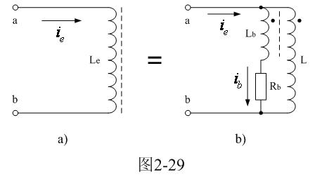 圖2-29-a中,Le是一個同時考慮渦流損耗因素的電感;L是變壓器原初級線圈的電感;Rb是鐵芯渦流損耗電阻;Lb是一個互感線圈,通過它把流過電阻Rb的電流感應到變壓器初級線圈中;當流過電阻Rb的電流增加時,流過通過Lb互感線圈的感應作用,使流過變壓器初級線圈L的電流也同時增加。