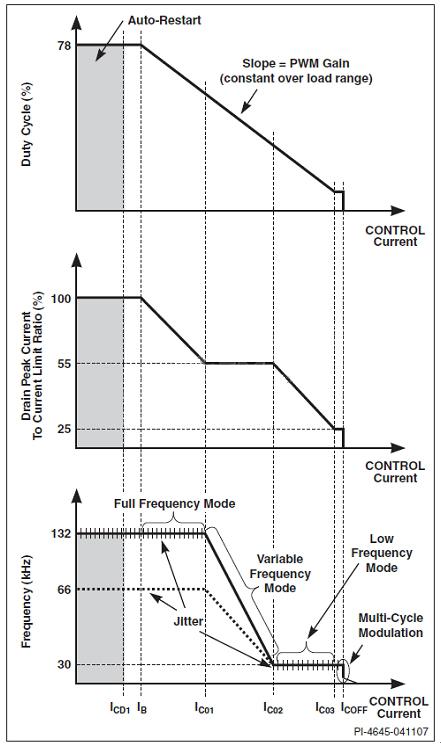 隨著輸出負(fù)載的降低,TOPSwitch-HX控制將切換至變頻模式(VFM)。在此模式下,功率MOSFET峰值漏極電流將保持不變,同時(shí)開關(guān)頻率會(huì)從132kHz的初始全頻(或66kHz,取決于用戶的選擇)下降到30kHz。占空比隨著負(fù)載的降低而減小,這一過程通過延長(zhǎng)開關(guān)脈沖之間的關(guān)斷時(shí)間來完成。開關(guān)頻率的降低導(dǎo)致開關(guān)損耗下降,并可在負(fù)載降低時(shí)維持電源效率恒定不變。
