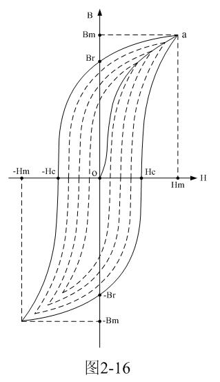 磁矯頑力的大小反映鐵磁材料保持剩磁狀態(tài)的能力。圖2-16表明,當(dāng)磁場(chǎng)按Hm→0→-Hc→-Hm→0→Hc→Hm次序變化時(shí),B所經(jīng)歷的相應(yīng)變化為Bm→Br→0→-Bm→-Br→0→Bm。于是得到一條閉合的B~H曲線,稱為磁滯回線。所以,當(dāng)鐵磁材料處于交變磁場(chǎng)中時(shí)(如變壓器中的鐵芯),它將沿磁滯回線反復(fù)被磁化→去磁→反向磁化→反向去磁,這個(gè)過(guò)程周而復(fù)始。