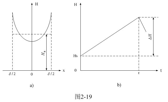 [page]圖2-19-a和圖2-19-b分別是由(2-61)式給出的,鐵芯片中磁場(chǎng)強(qiáng)度按水平方向分布的函數(shù)H(x)和按時(shí)間分布的函數(shù)H(t)曲線圖。
