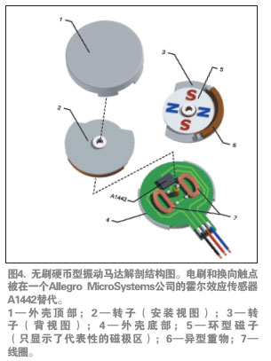 如前所述,無刷電機(jī)具有較長的壽命,并由于產(chǎn)生的電火花較少,也沒有了RFI干擾。無刷直流(BLDC)設(shè)計(jì)還提供業(yè)內(nèi)直徑最小、厚度最薄的扁平振動(dòng)馬達(dá)。圖4介紹了這種馬達(dá)的基本構(gòu)造。