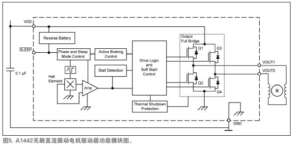 A1442是驅(qū)動(dòng)馬達(dá)唯一必須的的IC。圖5所示的功能模塊圖說明了設(shè)備運(yùn)行和先進(jìn)的特性。注意圖4和圖5中,采用集成的霍爾傳感器免除了外部霍爾傳感器,從而減少了馬達(dá)PCB元件數(shù)量。唯一所需的外部元件是一種標(biāo)準(zhǔn)電路特性——位于應(yīng)用馬達(dá)安裝PCB上的0.1µF的旁路電容,它用于降低在開關(guān)電源的電感負(fù)載時(shí)產(chǎn)生的瞬時(shí)電壓峰值。
