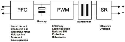 功率因數(shù)校正級(PFC),加上總線或DC鏈路電容,對于許多無法單獨優(yōu)化的不同因素來說是十分關(guān)鍵的?,F(xiàn)在,大部分電源都采用了有源PFC電路,亦即升壓轉(zhuǎn)換器,確保輸入電流與輸入電壓同相,使輸入端的正弦波失真最小化,從而減小傳導(dǎo)EMI,實現(xiàn)寬輸入范圍(85VAC~265VAC)。